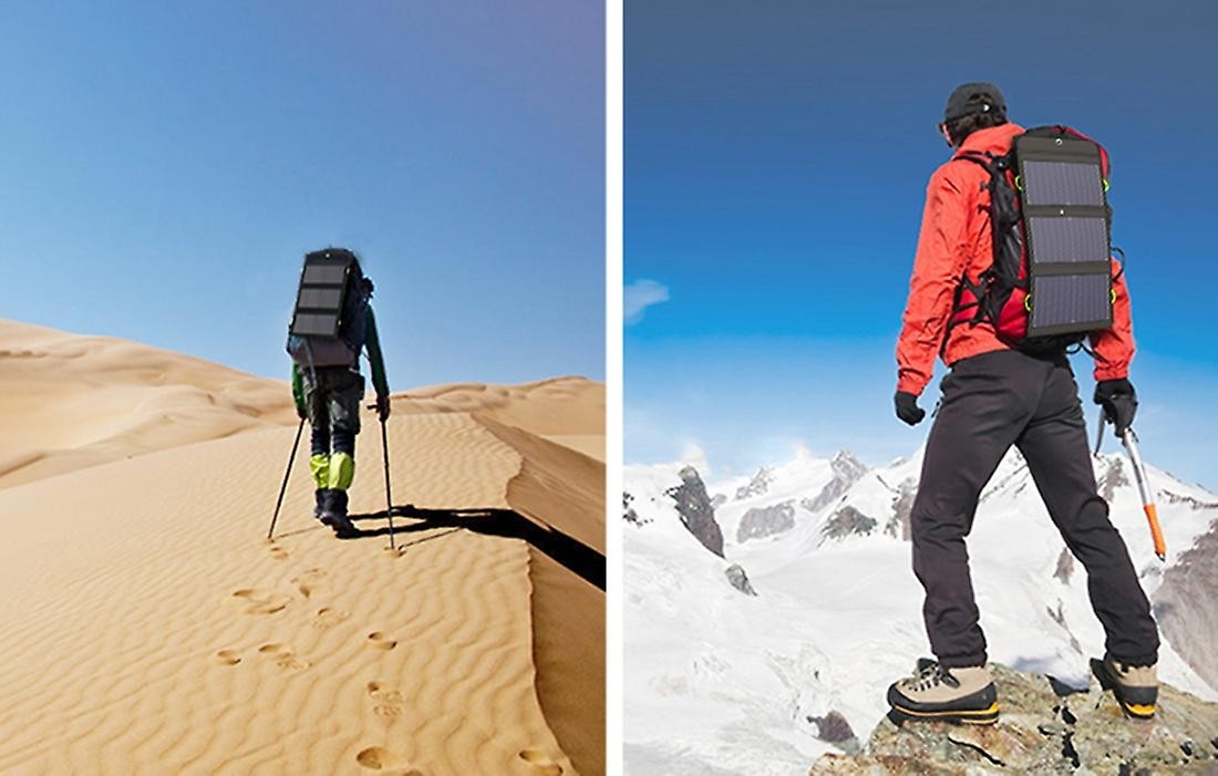 Acest încărcător solar portabil este potrivit pentru multe aplicații. Îl poți folosi într-o excursie de camping, în timp ce călătorești într-o camioneta sau într-o expediție montană. După pliere, produsul nu ocupă mult spațiu - îl poți pune cu ușurință în geanta de voiaj. În plus, cârligele metalice incluse (carabiniere) vă permit să-l atașați la rucsac. Profită de această soluție pentru a câștiga mai mult spațiu pentru a-ți împacheta lucrurile și a te bucura de confortul utilizării!